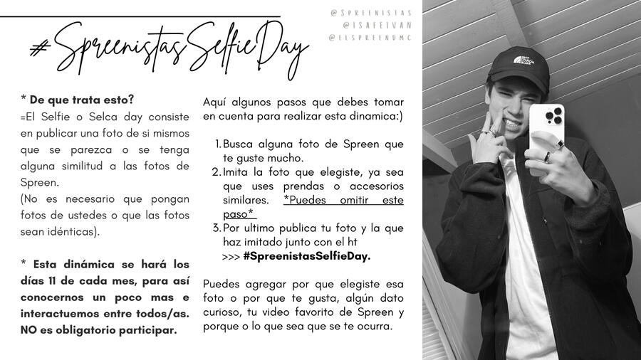 #SpreenistasSelfieDay: Esta dinámica se hace los días 11 de cada mes y consiste en buscar una foto de Spreen e imitarla, ya sea imitar la pose, vestimenta, accesorios, etc.