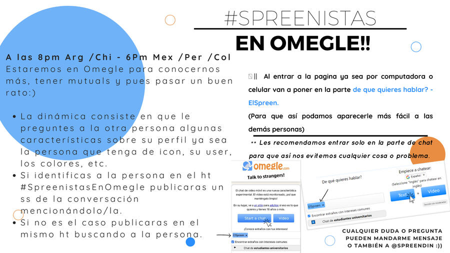 #SpreenistasEnOmegle: Esta dinámica no tiene una fecha fija pero cada mes trataremos de organizarnos para hacerla, consiste en conocer a más personas de la comunidad y averiguar por medio del chat de Omegle con quien estas hablando, tienes que preguntar algunas características del perfil de Twitter, subir la conversación mencionando a la persona, seguirse e interactuar. (En la cuenta de @Spreenistas tendrán mas información sobre los días en que e hará esta dinámica)